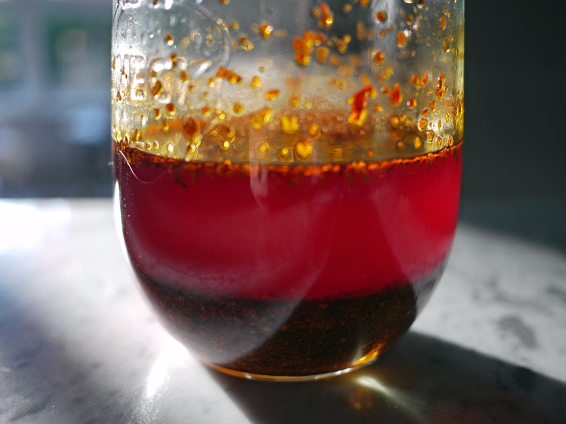 The combination produces a deep-red, moderately hot chili oil (la jiao you), a basic pantry essential used in abundance to dress "liangban" cold salads, noodles, dumplings, wontons and more.